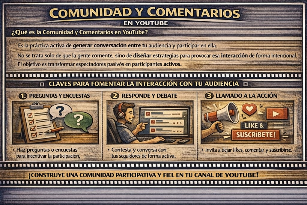 Qué es: La gestión de comentarios y la construcción de comunidad en YouTube es la práctica activa de generar conversación entre tu audiencia y participar en ella. No se trata solo de que la gente comente, sino de diseñar estrategias para provocar esa interacción de forma intencional. El objetivo es transformar espectadores pasivos en participantes activos.