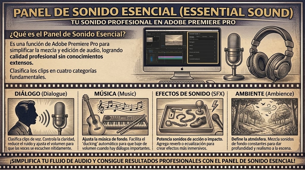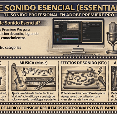 Qué es: El panel Essential Sound es una función de Adobe Premiere Pro diseñada para simplificar el proceso de mezcla y edición de audio, ayudando a los usuarios a conseguir un sonido de calidad profesional sin necesidad de tener conocimientos extensos en producción de audio.