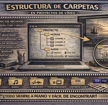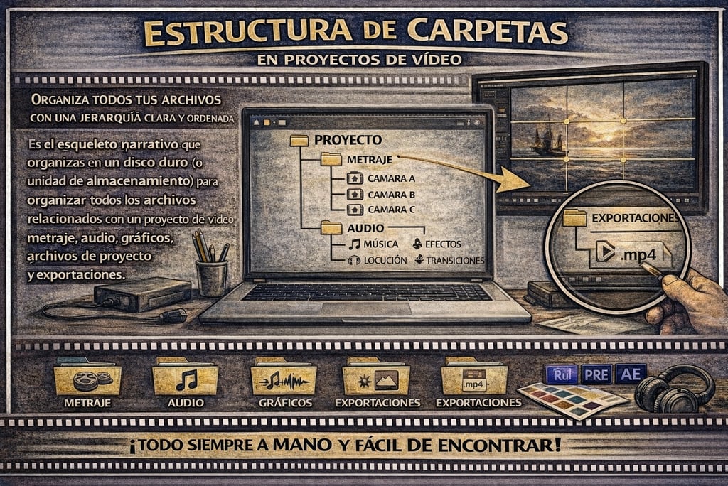 Qué es: La estructura de carpetas es el sistema jerárquico de directorios que creas en tu disco duro (o unidad de almacenamiento) para organizar todos los archivos relacionados con un proyecto de vídeo: metraje, audio, gráficos, archivos de proyecto y exportaciones.