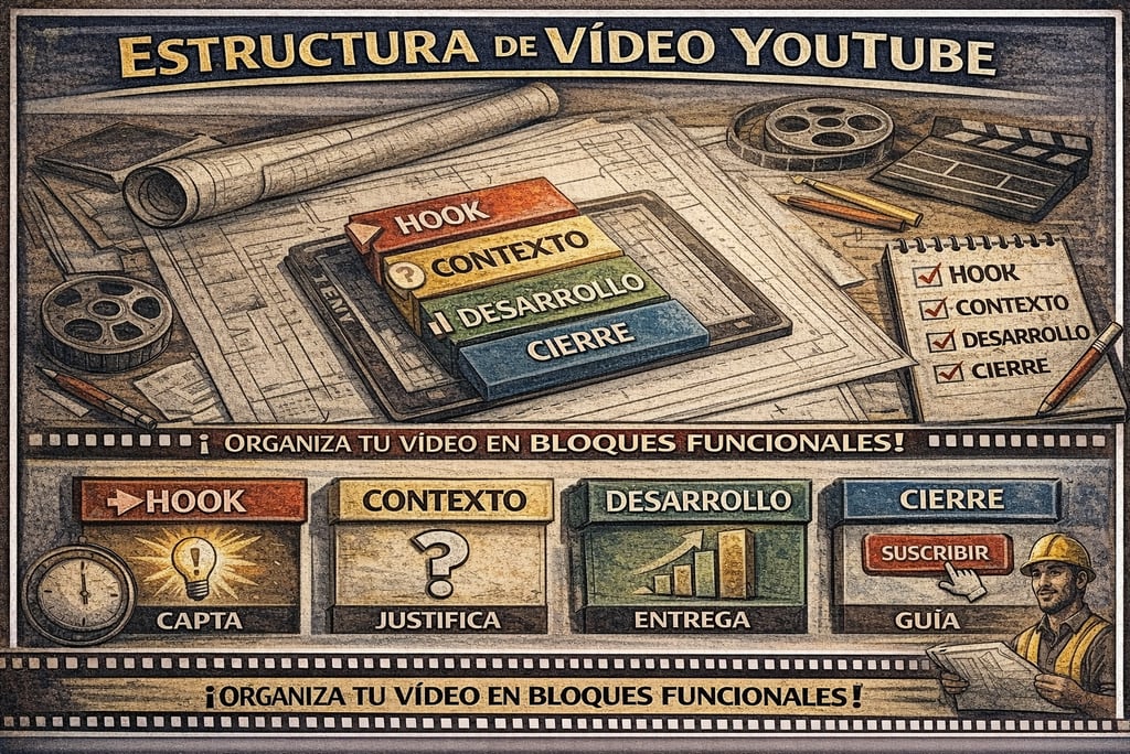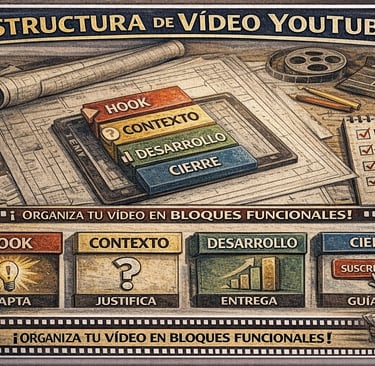 Qué es: Es el esqueleto narrativo que organiza un vídeo de YouTube en bloques funcionales —hook, contexto, desarrollo y cierre— diseñados para mantener al espectador viendo el mayor tiempo posible. Cada bloque tiene una función concreta: capturar la atención, justificar por qué quedarse, entregar valor progresivamente y guiar hacia una acción final. Es el equivalente a tener un plano de construcción antes de levantar una casa: sin él, el vídeo se improvisa y pierde gente.