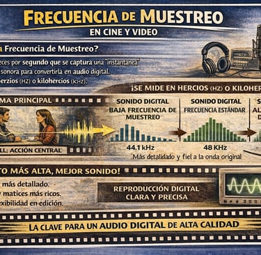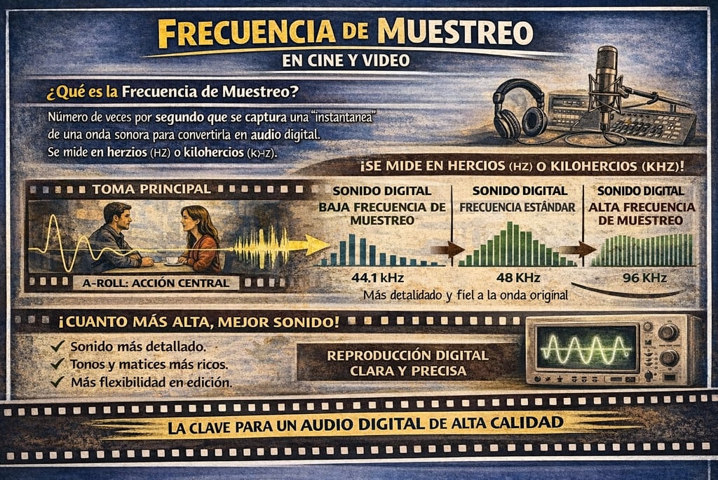 Qué es: Es el número de veces por segundo que se captura una "instantánea" de una onda sonora para convertirla en audio digital. Se mide en hercios (Hz) o kilohercios (kHz). Cuanto mayor es la frecuencia de muestreo, más fiel es la representación digital del sonido original.
