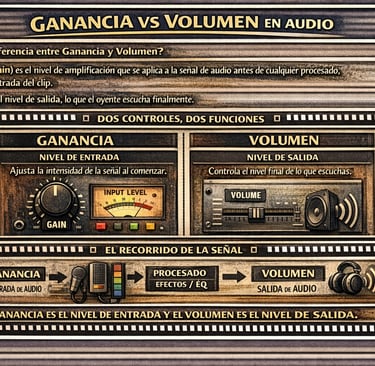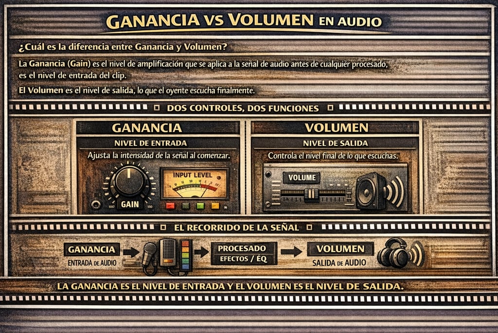 Qué es: La ganancia (gain) es el nivel de amplificación que se aplica a la señal de audio antes de cualquier procesado: es el punto de partida, el nivel de entrada del clip. El volumen es el nivel de salida, lo que el oyente finalmente escucha. Son dos controles distintos que actúan en momentos distintos del recorrido de la señal.