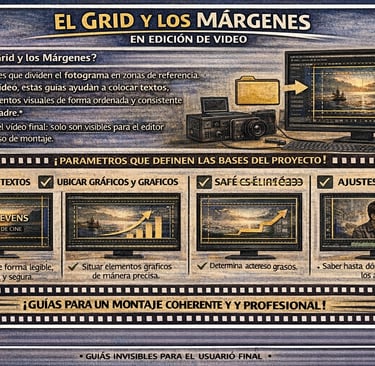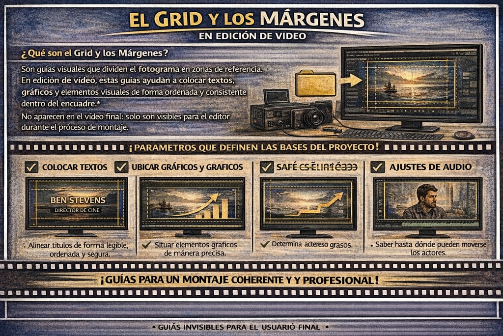 Qué es: El grid (cuadrícula) y los márgenes son guías visuales que dividen el fotograma en zonas de referencia. En edición de vídeo, estas guías ayudan a colocar textos, gráficos y elementos visuales de forma ordenada y consistente dentro del encuadre. No aparecen en el vídeo final: solo son visibles para el editor durante el proceso de montaje.