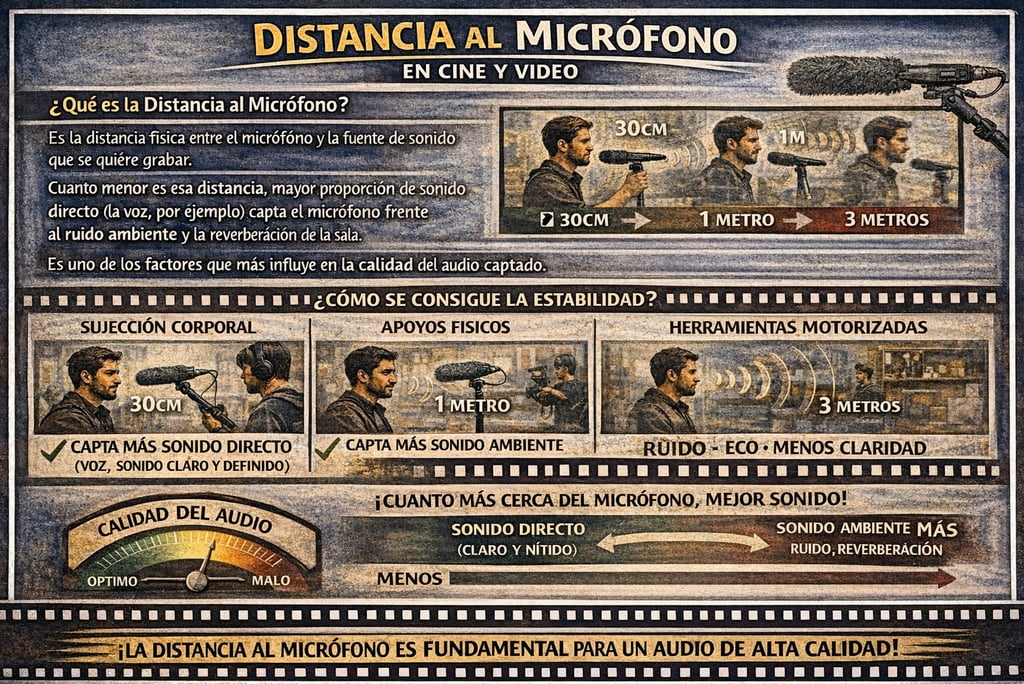 Qué es: Es la distancia física entre el micrófono y la fuente de sonido que se quiere grabar. Cuanto menor es esa distancia, mayor proporción de sonido directo (la voz, por ejemplo) capta el micrófono frente al ruido ambiente y la reverberación de la sala. Es uno de los factores que más influye en la calidad del audio captado.