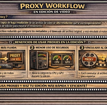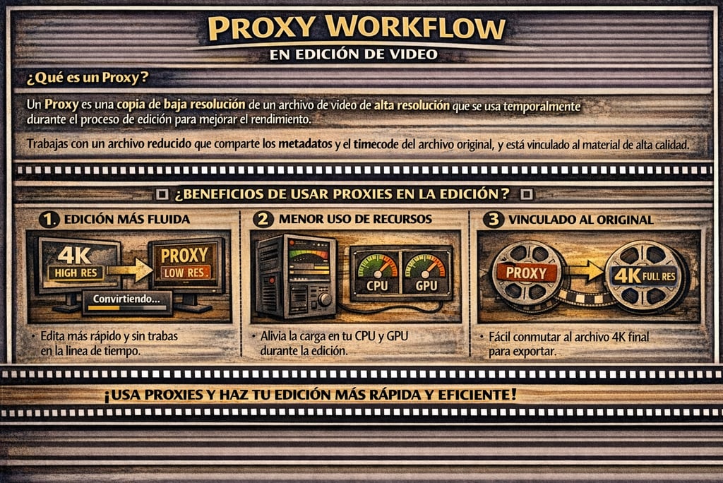 Qué es: Un proxy es una copia de baja resolución de un archivo de vídeo de alta resolución que se usa temporalmente durante el proceso de edición para mejorar el rendimiento.