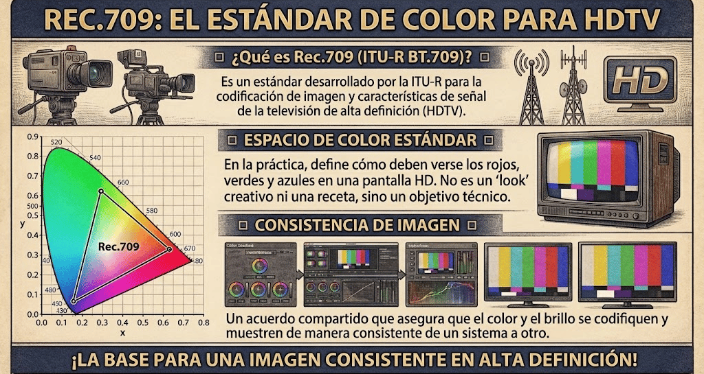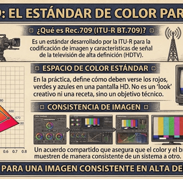 En la práctica cotidiana, cuando alguien dice "Rec.709" está hablando del espacio de color que define cómo deben verse los rojos, verdes y azules en una pantalla HD estándar.