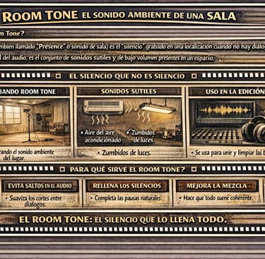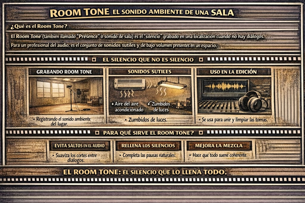 Qué es: El room tone (también llamado presence o sonido de sala) es el "silencio" grabado en una localización o espacio cuando no se están pronunciando diálogos.