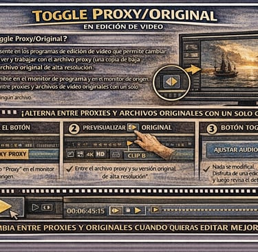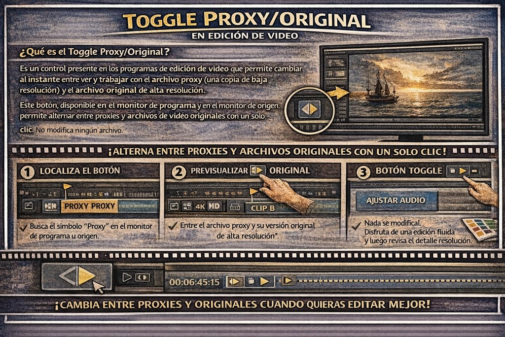 Qué es: El toggle proxy/original es un control presente en los programas de edición de vídeo que permite cambiar al instante entre ver y trabajar con el archivo proxy (una copia de baja resolución) y el archivo original de alta resolución.